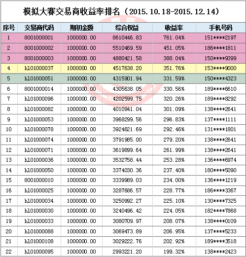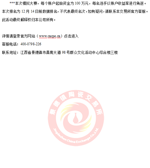 景德鎮(zhèn)陶瓷交易所首屆昌南杯模擬交易大賽10月18日火熱開賽以來,參賽人數(shù)持續(xù)攀升。通過近兩個(gè)月模擬交易大賽的鍛煉,參與模擬交易大賽的投資人會(huì)員對(duì)陶瓷藝術(shù)品投資的認(rèn)知度不斷提高,比賽也漸入佳境。截止12月14日收盤,模擬賬號(hào)"8001000001"以總收益率761.04%的成績拔得頭籌。"8001000002"以總收益451.05%的成績緊隨其后。"8001000003"以總收益388.04%成績位列第三。前二十選手的總收益也都在100%以上,值得慶賀。接下來的賽況如何,我們拭目以待!報(bào)名入口請(qǐng)點(diǎn)擊