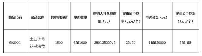 本次中簽分配方式按持倉(cāng)市值優(yōu)先分配規(guī)則,請(qǐng)廣大參與申購(gòu)的投資會(huì)員關(guān)注交易賬號(hào)中持倉(cāng)數(shù)量和資金變化情況。《王亞洲青花書(shū)法盤(pán)》將于2016年11月15日正式掛牌交易。