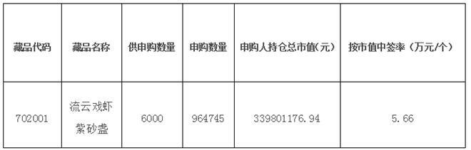 本次中簽分配方式按持倉(cāng)市值搖號(hào)中簽,請(qǐng)廣大參與申購(gòu)的投資會(huì)員關(guān)注交易賬號(hào)中持倉(cāng)數(shù)量和資金變化情況。《流云戲蝦紫砂盞》將于2017年1月19日正式掛牌交易。